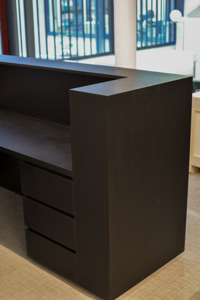 Réalisé en latté revêtu de stratifié noir mat sur l’ensemble des faces visibles. La façade côté clientèle intègre un plateau en pierre et en supporte le porte-à-faux.