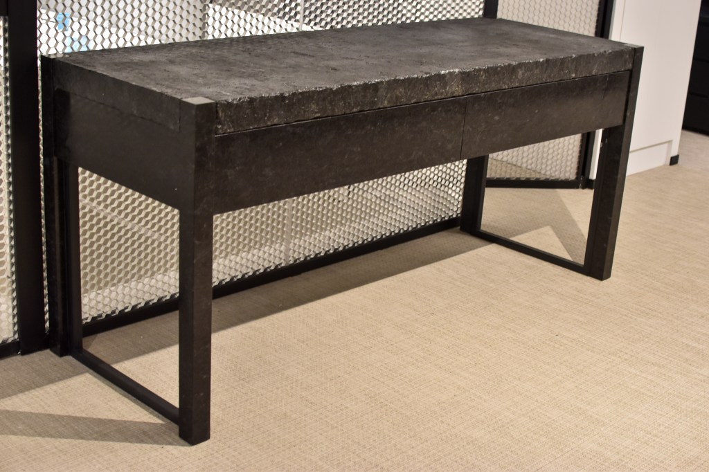 Pieds, plateau et façades de tiroir en marbre. Réalisation de la structure et du bloc tiroir