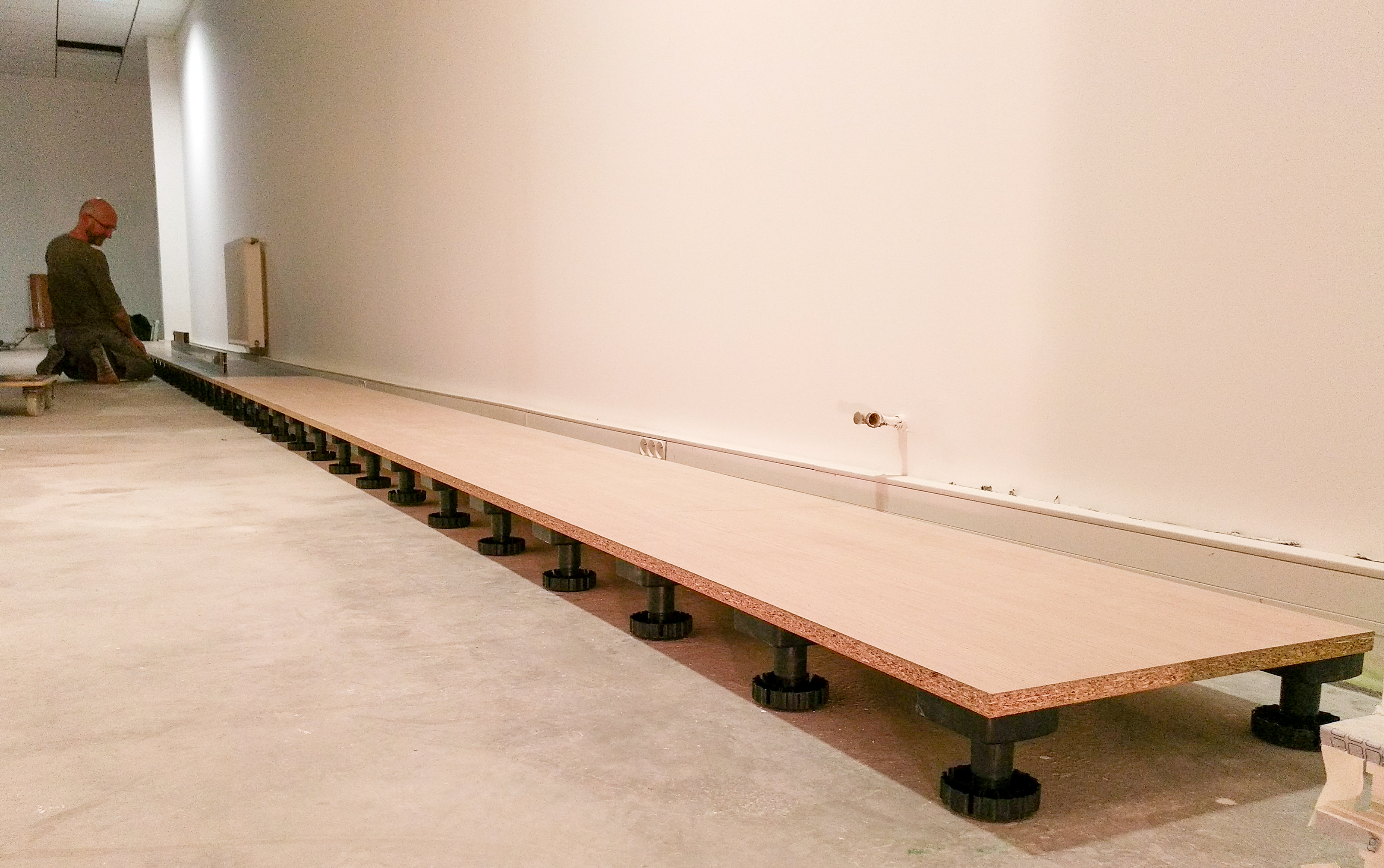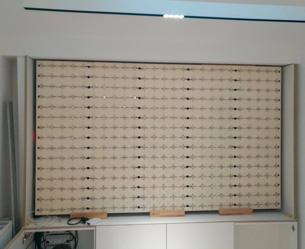 Le meuble intègre des rangements en partie basse, et la partie supérieure a été conçue pour pouvoir accueillir le panneau technique supportant les 375 leds éclairant le marbre