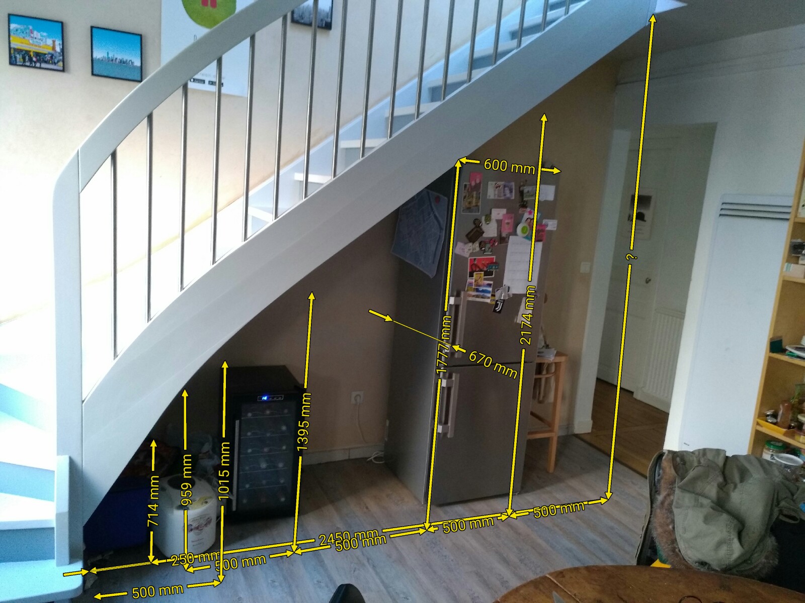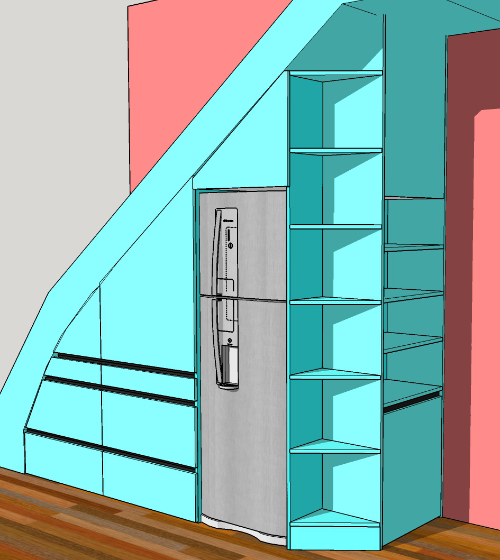 L’ensemble est constitué d’un bloc à tiroirs et placards encadrant le réfrigérateur, et d’une partie placard perpendiculaire latérale permettant d’exploiter toute la largeur de l’escalier. Un ensemble d’étagères triangulaires joignent les deux parties.
