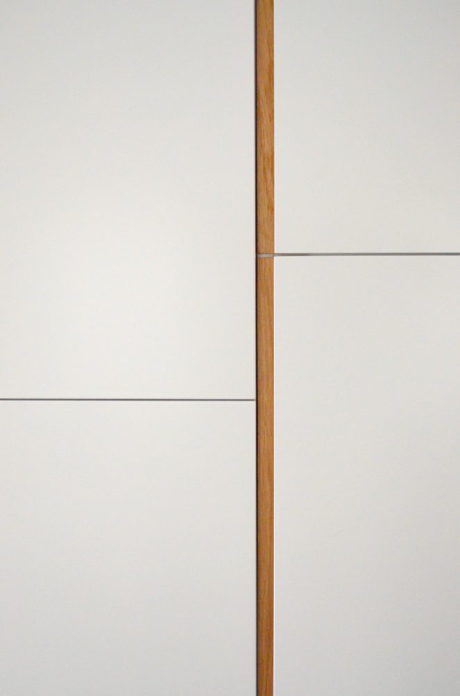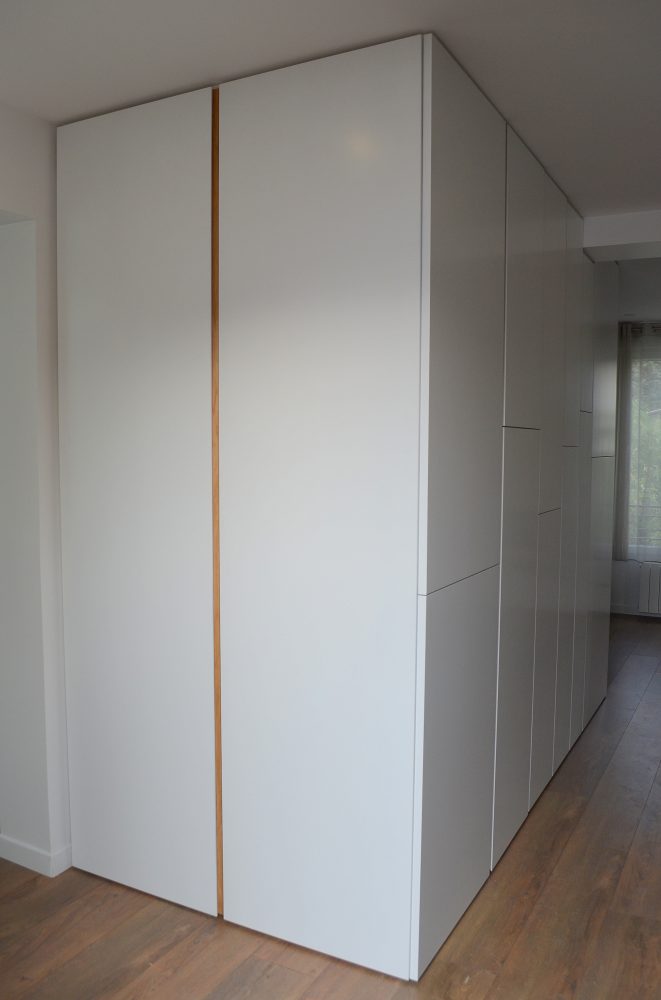 Pour habiller un mur en L, et stocker toutes les chaussures d’une famille de 4 personnes, conception, réalisation et pose d’une armoire à chaussures en MDF laqué, avec prises de mains en chêne.
