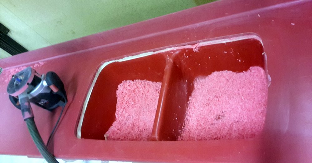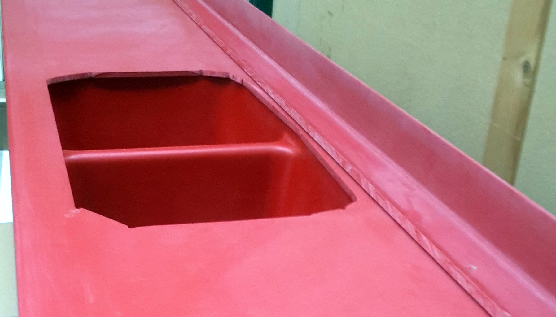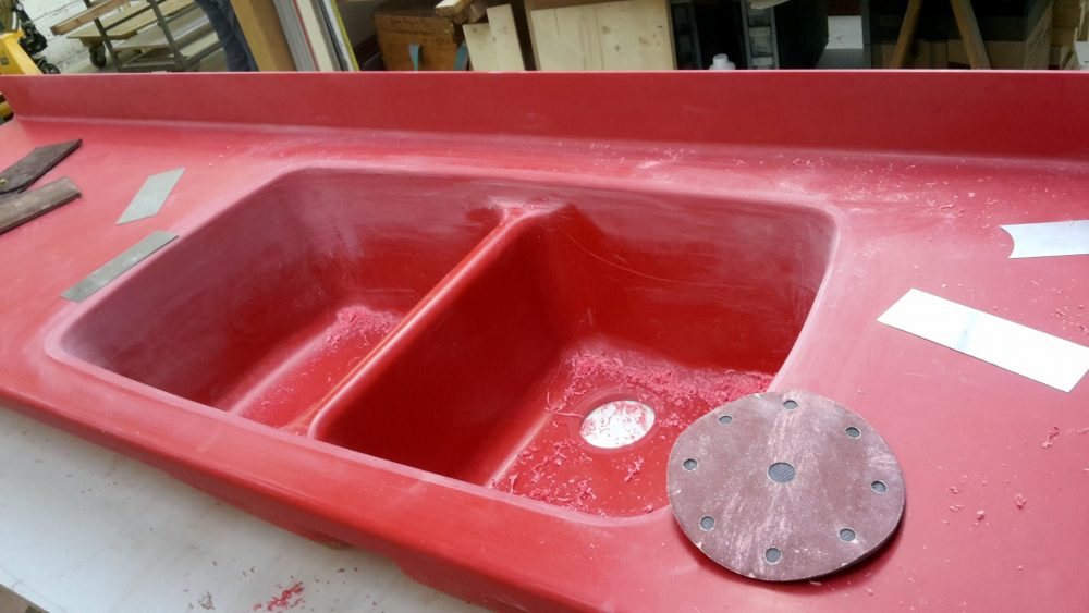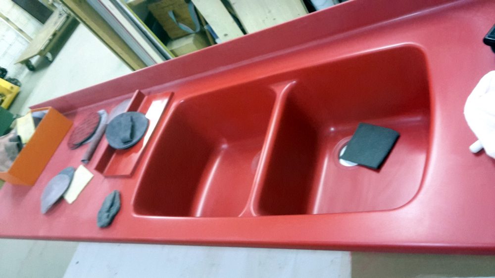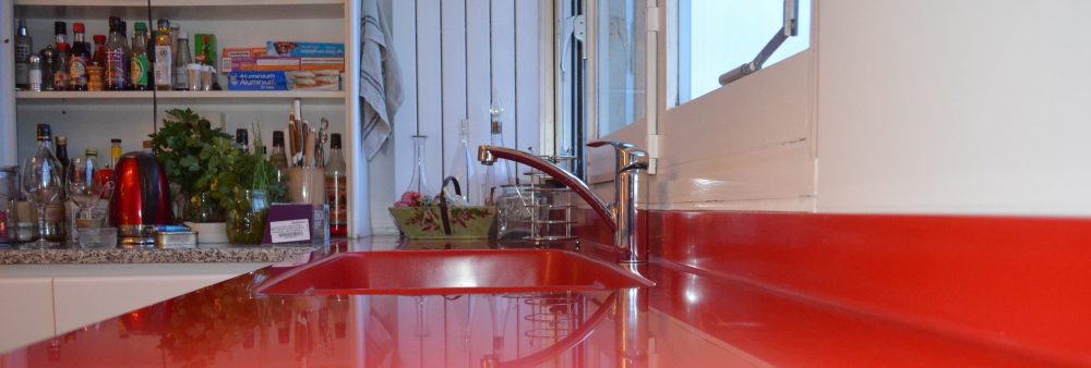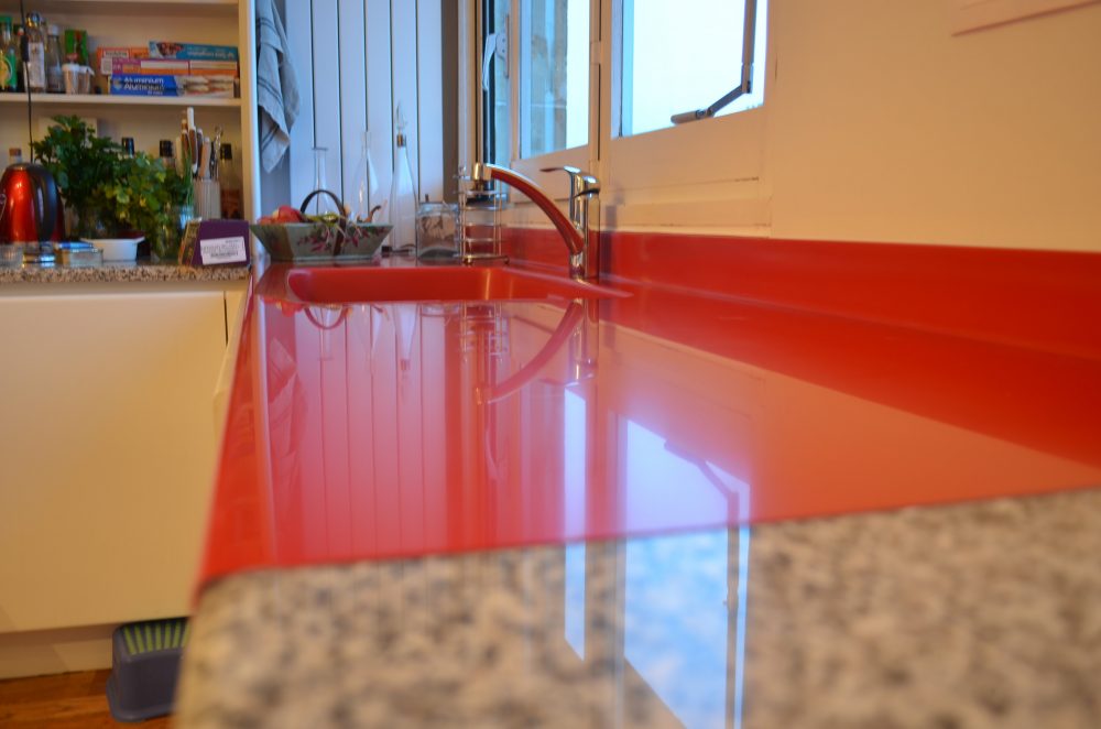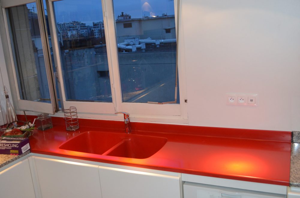 Ce modèle rouge en Kerrock a entièrement été assemblé et façonné sur mesure. Un minutieux travail d’usinage et 7 passes de ponçage ont été nécessaires pour obtenir cet effet légèrement brillant, sans jointures, donnant l’impression qu’il s’agit d’une seule et même pièce, comme si l’évier était moulé dans le plan de travail.