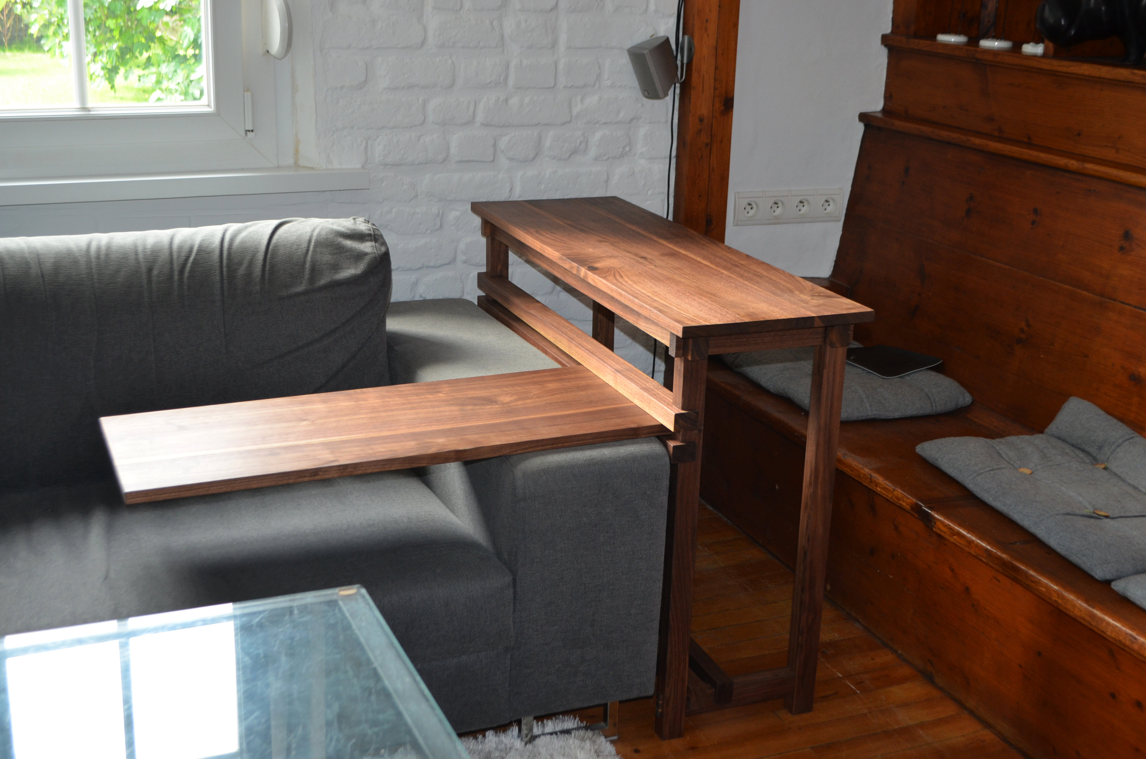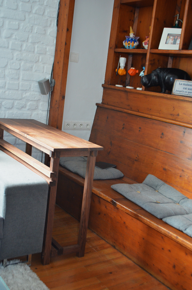 Entièrement réalisé en noyer US massif, sur mesure, conçu pour pouvoir être utilisé en petit bureau utilisant l’assise de la bibliothèque existante, mais aussi comme petit support d’ordinateur portable d’appoint, depuis le canapé